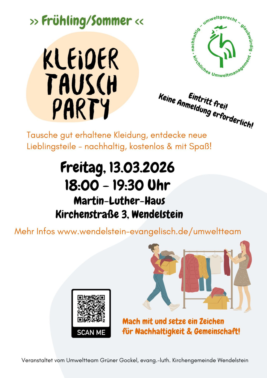 Am 10. Oktober 2025 fand die erste Kleidertauschparty im Martin-Luther-Haus statt. Sie stand unter dem Jahresthema „Bewusster Konsum – weniger ist mehr“ und fand großen Anklang. Ohne Anmeldung konnten Interessierte bis zu zehn gut erhaltene Kleidungsstücke oder Accessoires abgeben und nach neuen Lieblingsstücken stöbern. Der Schwerpunkt lag – passend zur Jahreszeit – auf Herbst- und Wintermode sowie Mützen, Schals, Taschen und Schmuck. Einige Besucher tauschten, andere suchten nur – alle trugen zum Erfolg der Premiere bei.